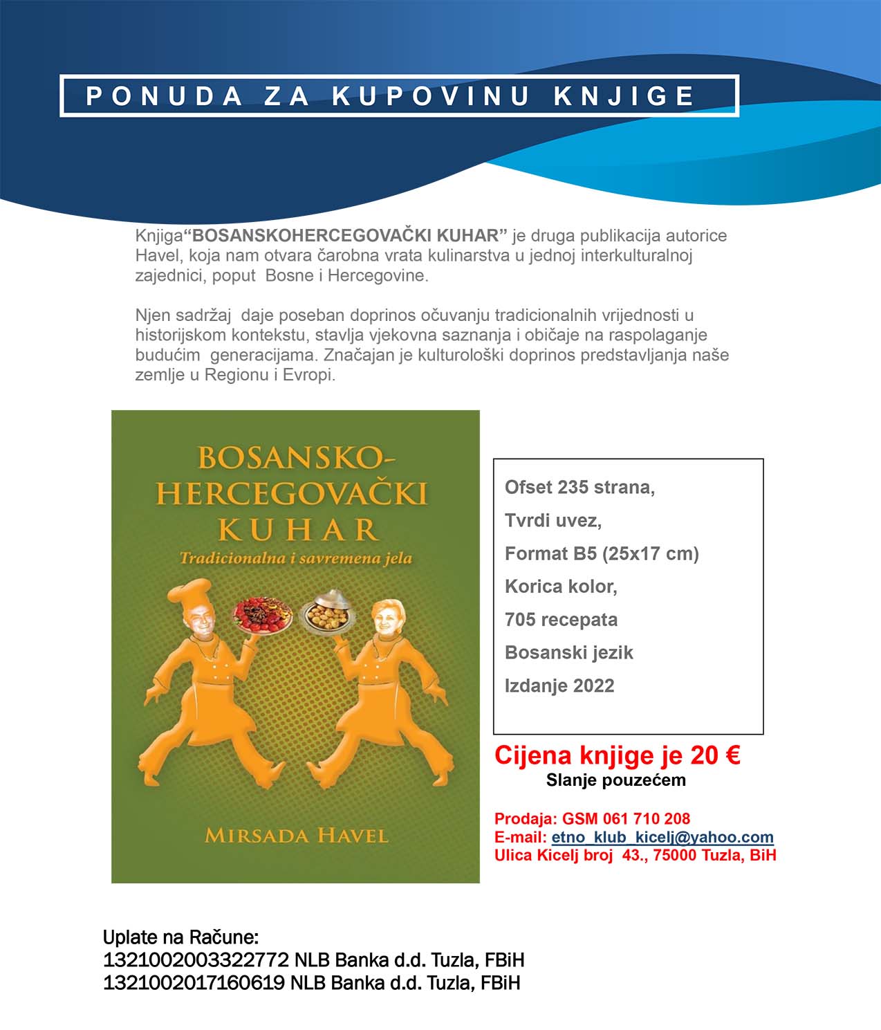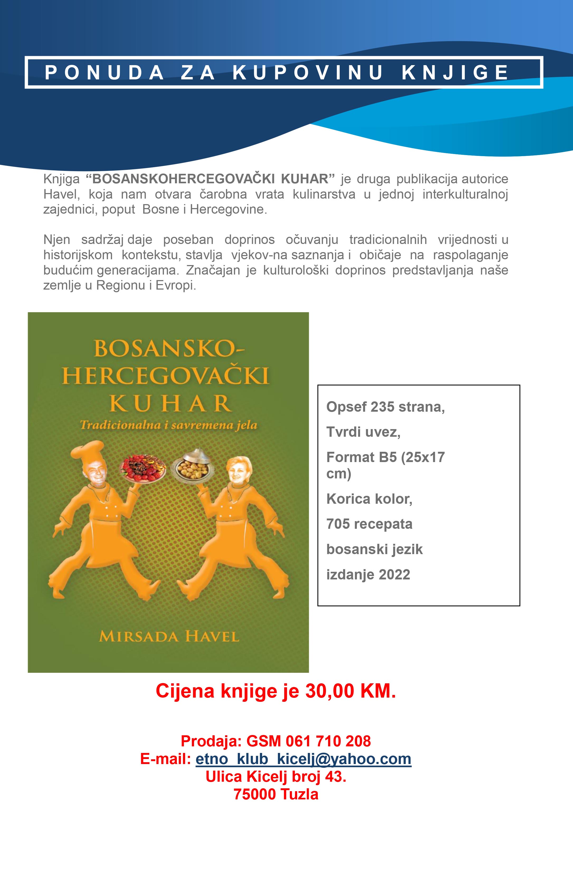 Knjiga“BOSANSKOHERCEGOVAČKI KUHAR” je druga publikacija autorice Havel, koja nam otvara čarobna vrata kulinarstva u jednoj interkulturalnoj zajednici, poput Bosne i Hercegovine.